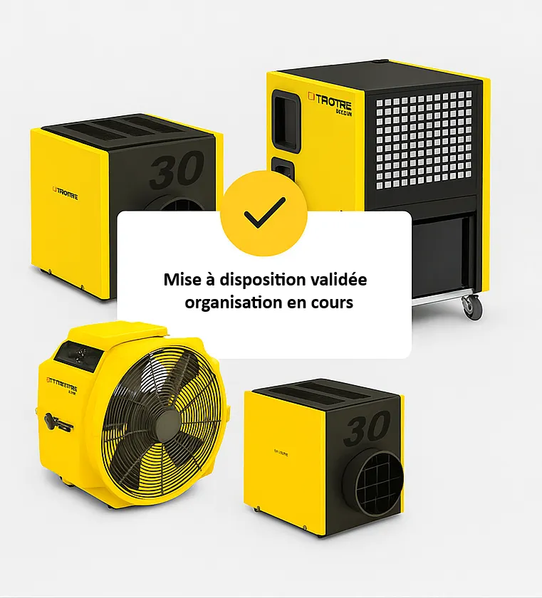 La mise à disposition débute par la sélection de la période d’utilisation et du matériel adapté à votre situation (dégât des eaux, humidité persistante, séchage de matériaux).